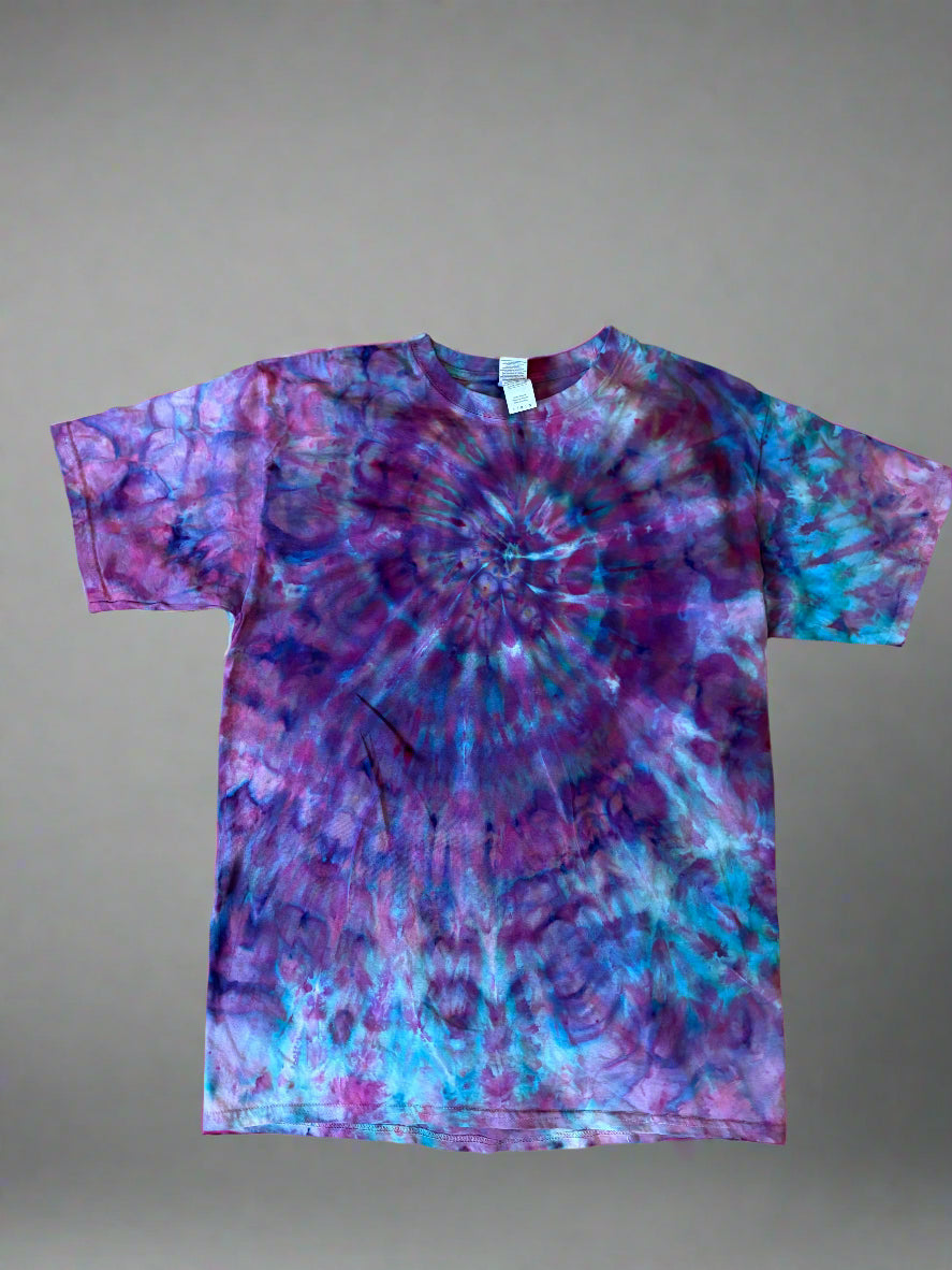 Elevate your everyday style with a one-of-a-kind ice-dyed t-shirt. This large unisex shirt is hand-dyed in Ottawa using a slow-fusion ice dyeing technique and professional-grade fiber-reactive dyes that chemically bond to the fabric—ensuring bold color that never fades, even after repeated washes.
