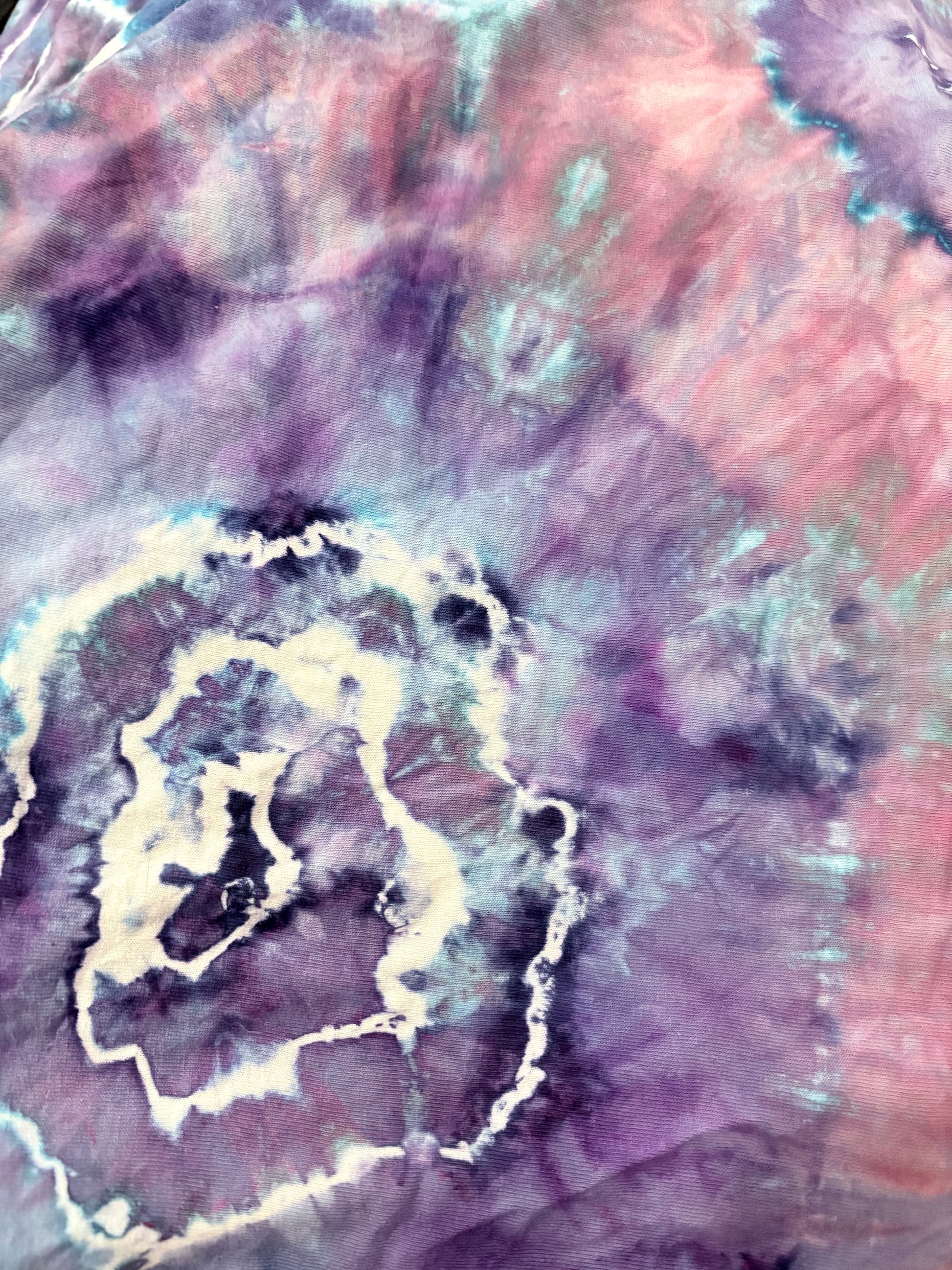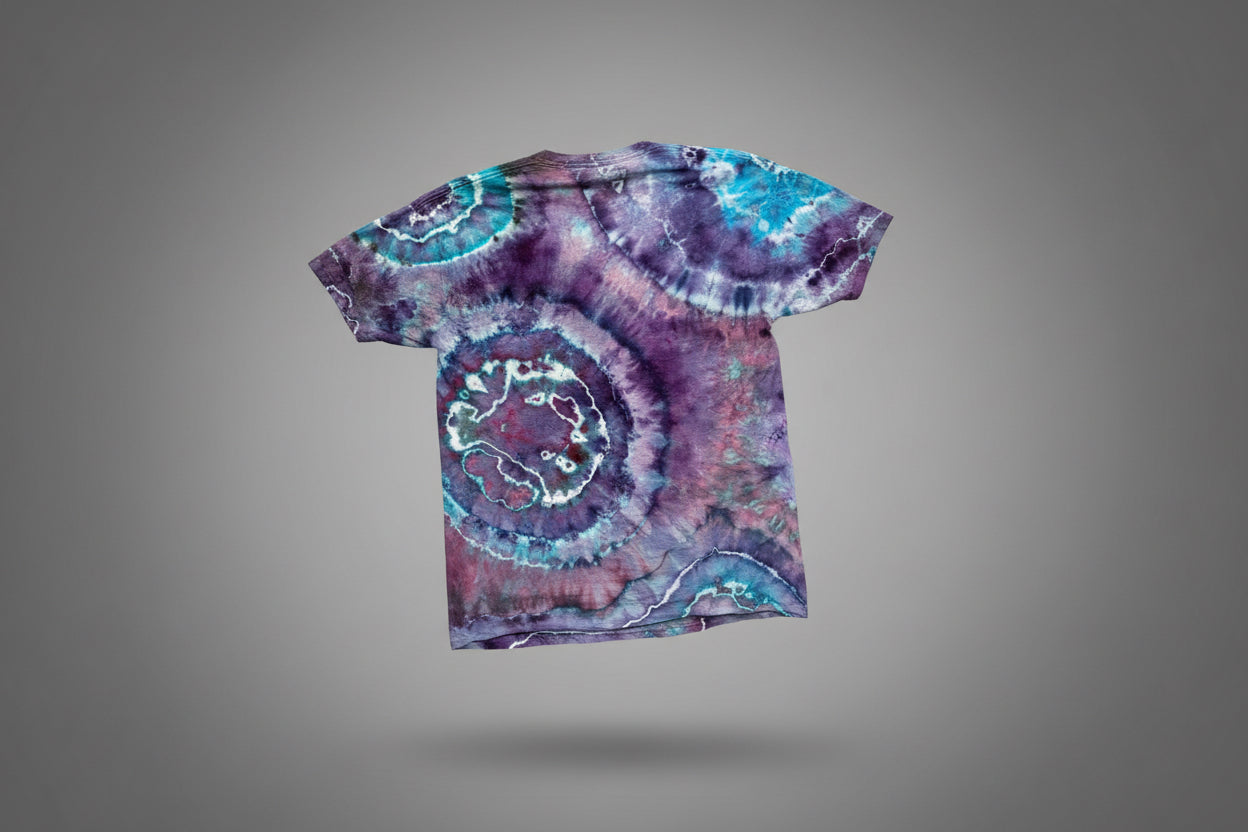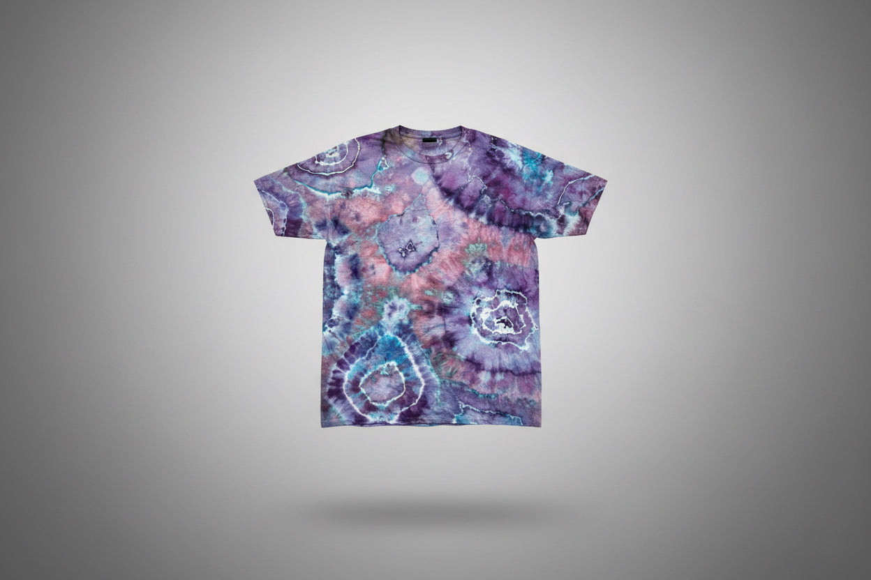 Drift into deep water tones with Abyssal Bloom, a one-of-a-kind hand-dyed tee where indigo blues, stormy purples, and flashes of mineral teal collide. Crackled white veins cut through the surface like lightning under water, giving this piece a moody, cosmic depth that shifts with the light.