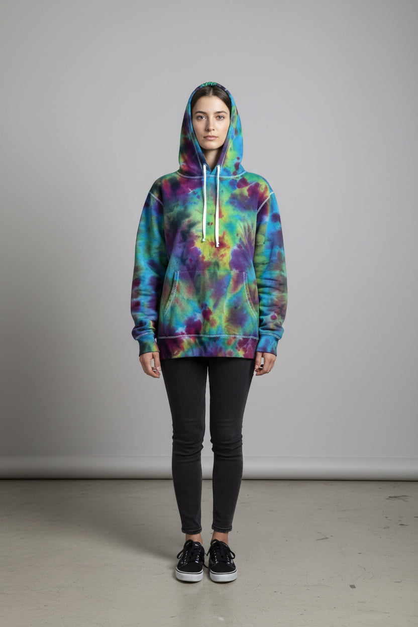 Deep forest greens, stormy blues, and wine-dark purples collide in Boreal Alchemy, a heavyweight premium hoodie dyed for depth, movement, and quiet power. The palette evokes northern forests at dusk—layered, moody, and alive with subtle contrast.
