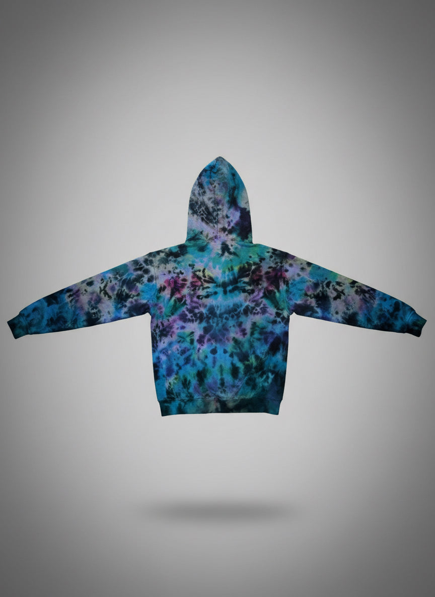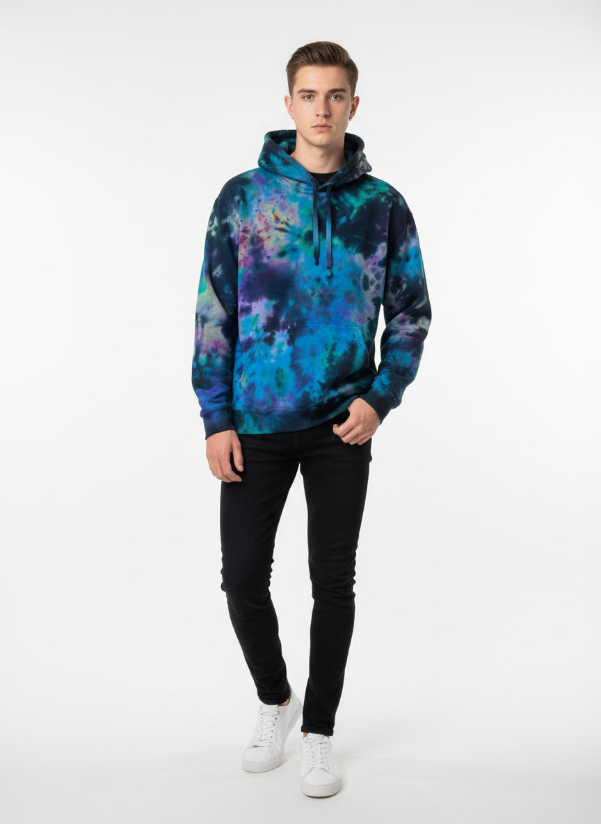 Meet the Cosmic Tidebreaker — a one-of-a-kind, hand-dyed Comfort Colors hoodie that feels like slipping into a midnight sky painted by the universe itself. Rich blues, nebula purples, teal swirls, and soft starburst highlights collide on a deep, shadowy base, creating a galaxy-washed fleece you can feel.