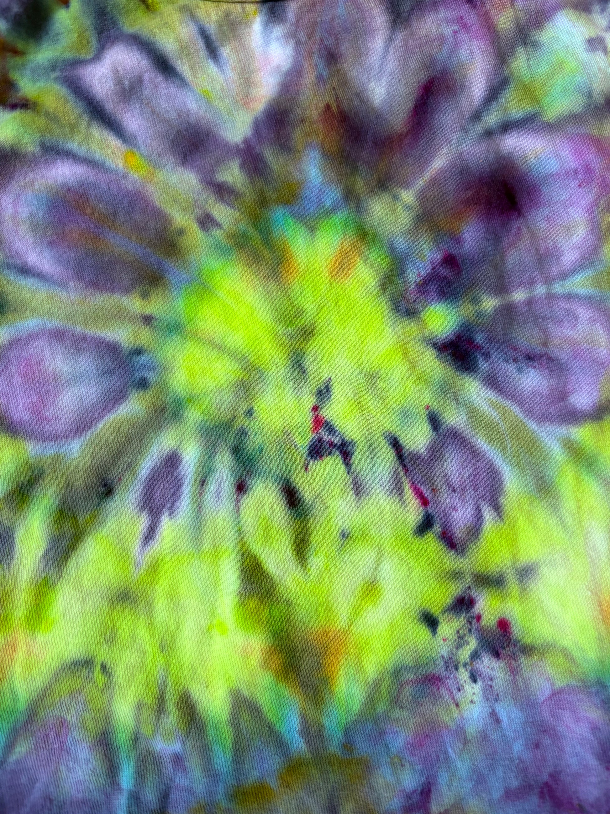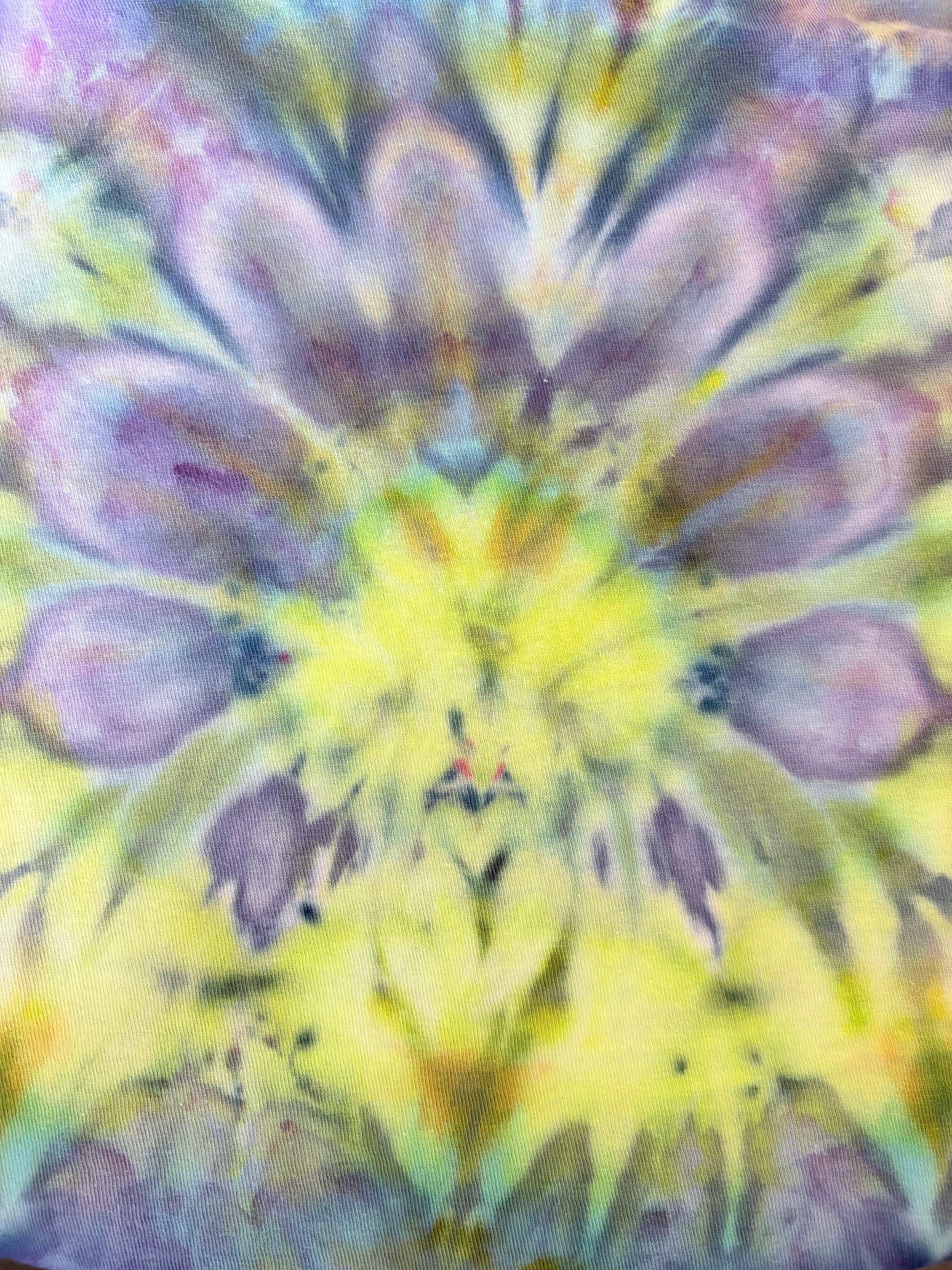 The Solar Bloom Tie-Dye Tank Top radiates with layers of yellow, violet, green, and hints of fiery orange — a floral starburst that feels both cosmic and earthy. The design blooms outward across the chest, creating a bold, symmetrical centerpiece full of motion and light.