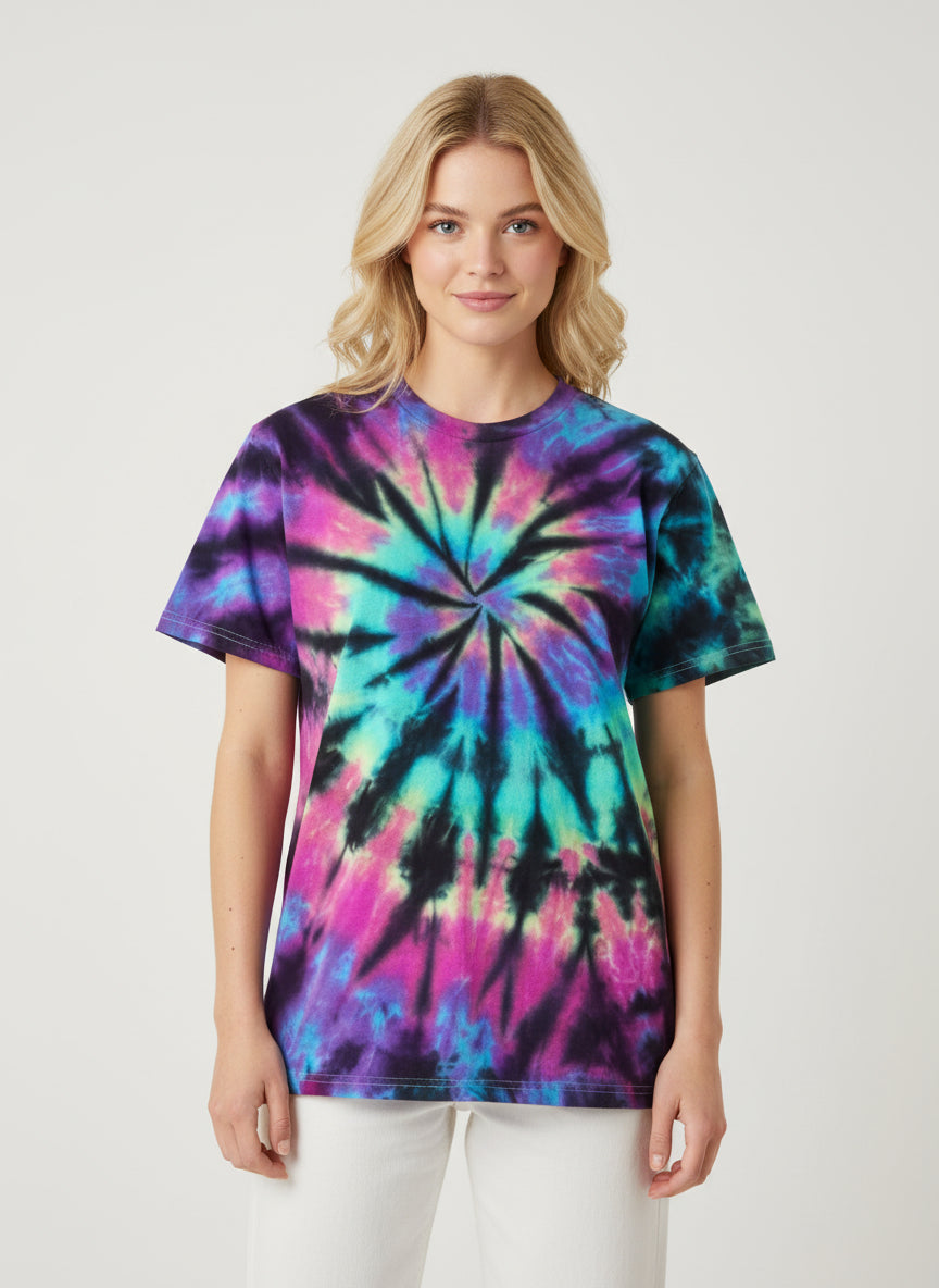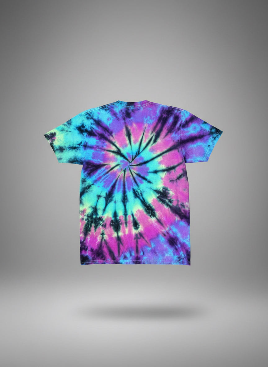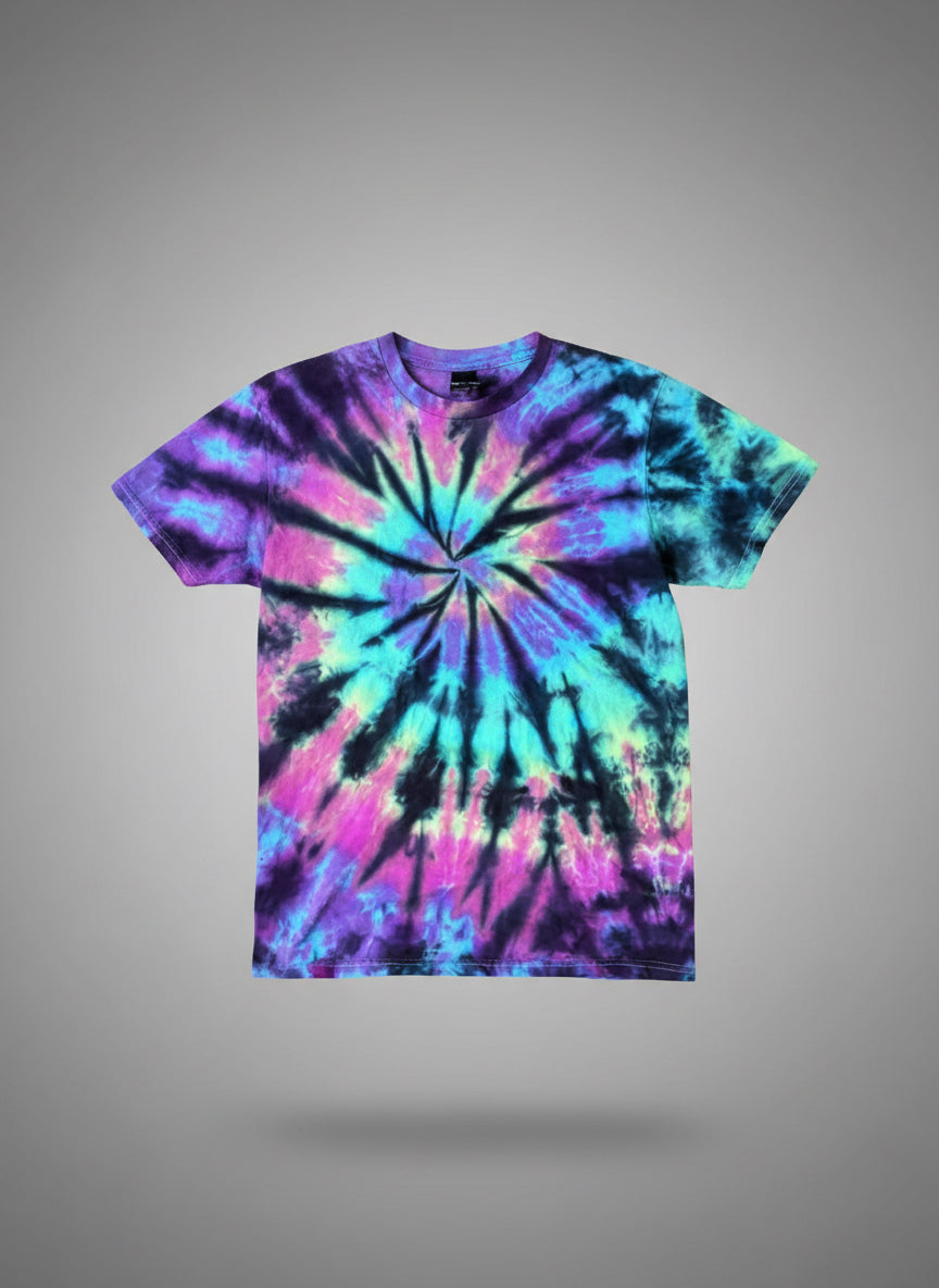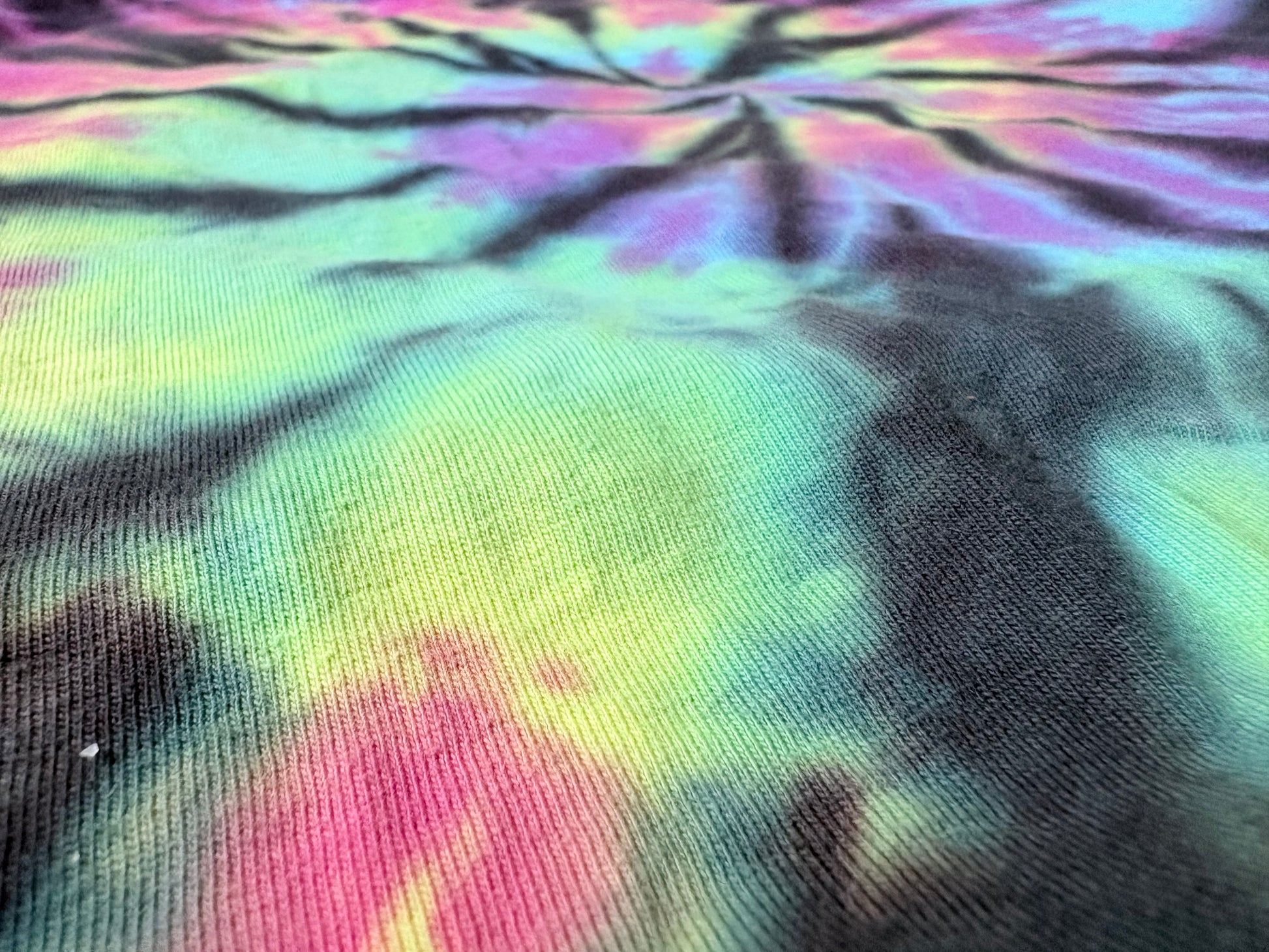 A signature Mixed Results spiral bursting with neon purple, aqua, electric green, and bright magenta, grounded by deep shadowy blacks. This piece mixes cosmic energy with classic psychedelic flow — bold, vibrant, and unmistakably handmade. One-of-a-kind, even in the repeating Dreamcoil series.