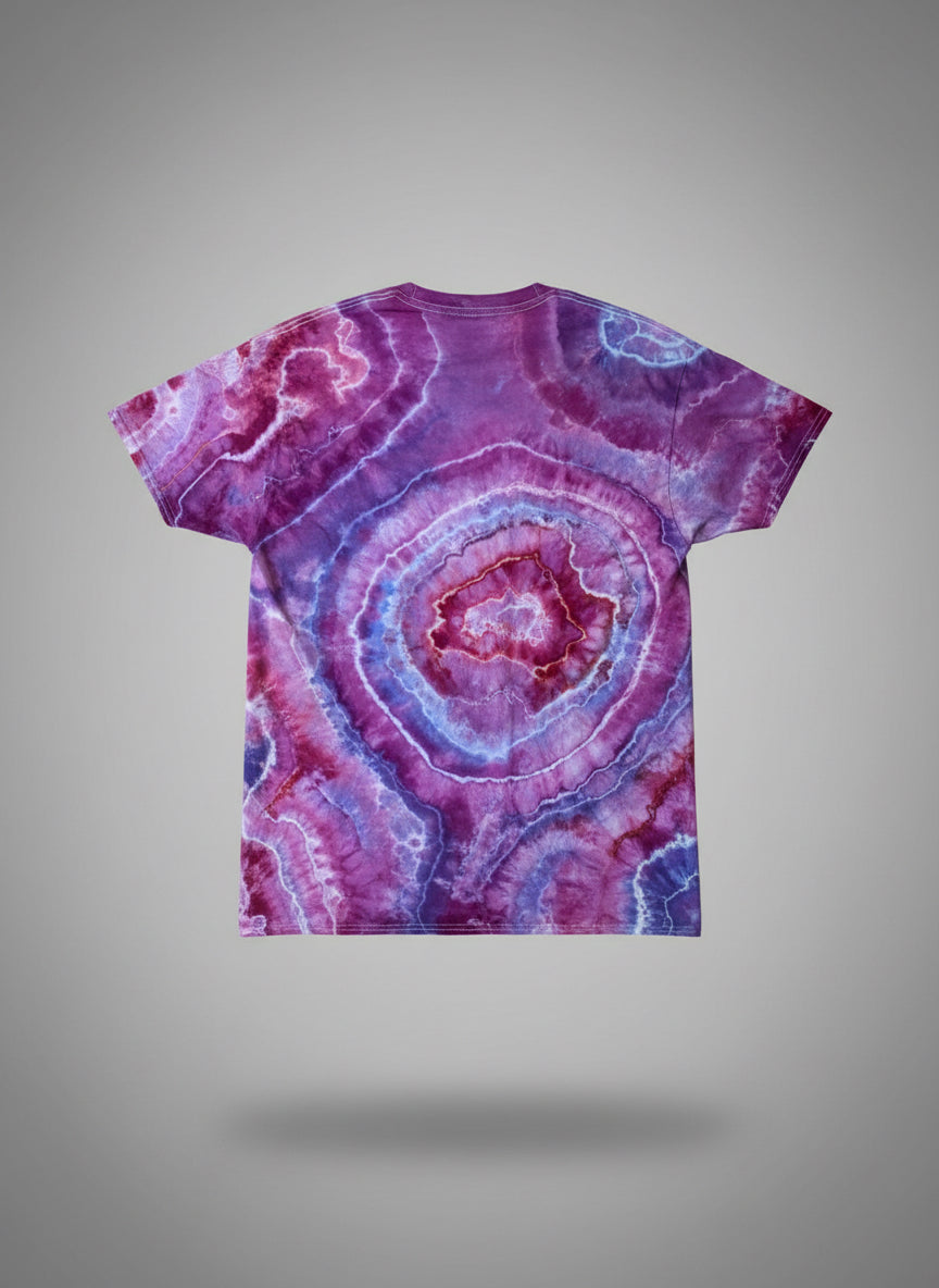 Plum Tesseract is a one-of-a-kind, upcycled tie-dye tee that feels folded through space and time. Layers of plum, wine, and soft violet ripple across the fabric, intersected by lightning-white lines that bend and branch like a geometric echo trapped in motion.