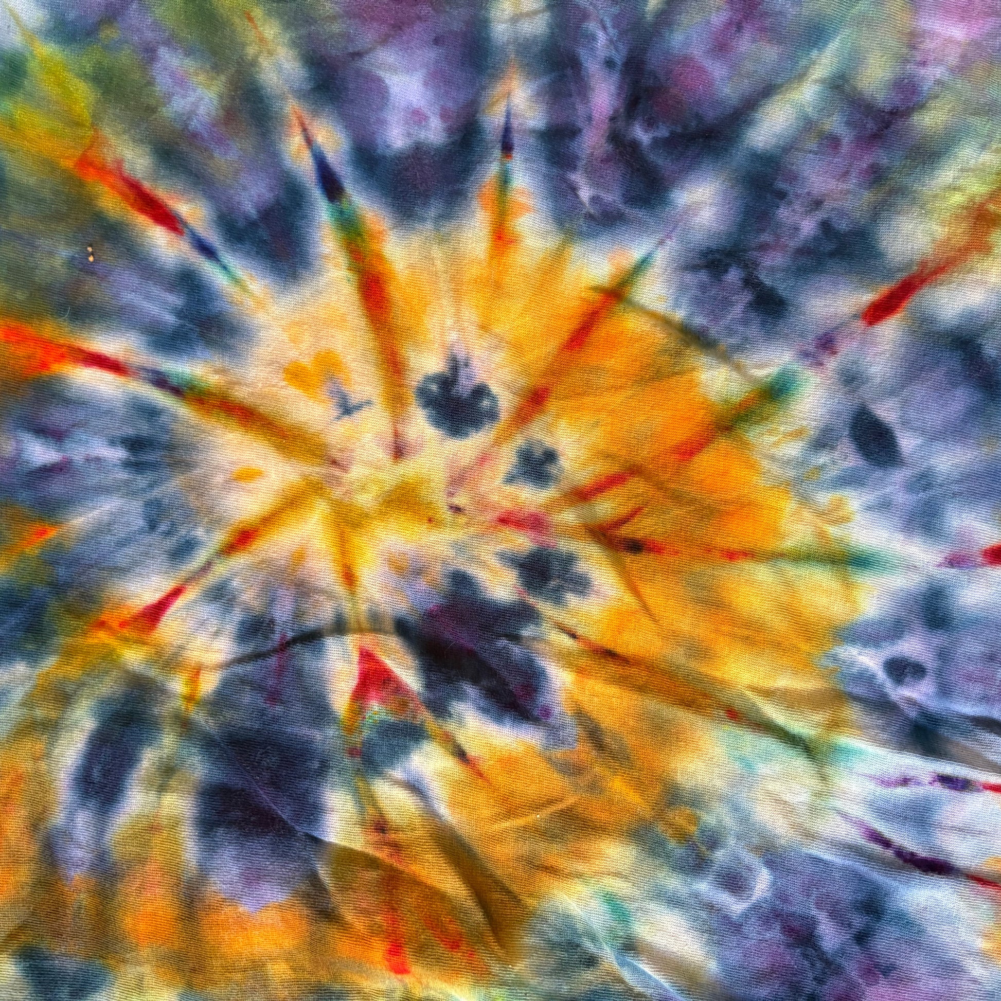 The Sunburst Serpent Tie-Dye Tee glows with golden rays, fiery orange, violet shadows, and streaks of deep blue — spiraling outward in a hypnotic burst. Its mirrored symmetry and winding energy echo the movement of a serpent basking in the sun, both radiant and mysterious.