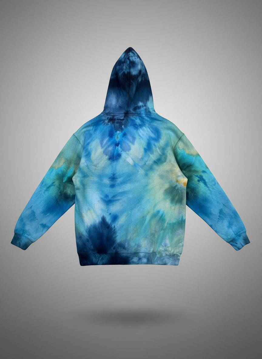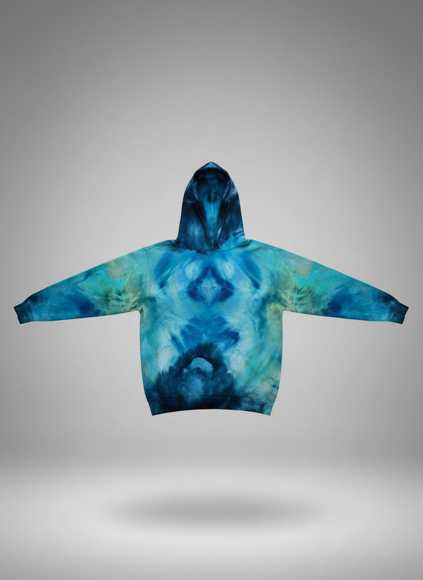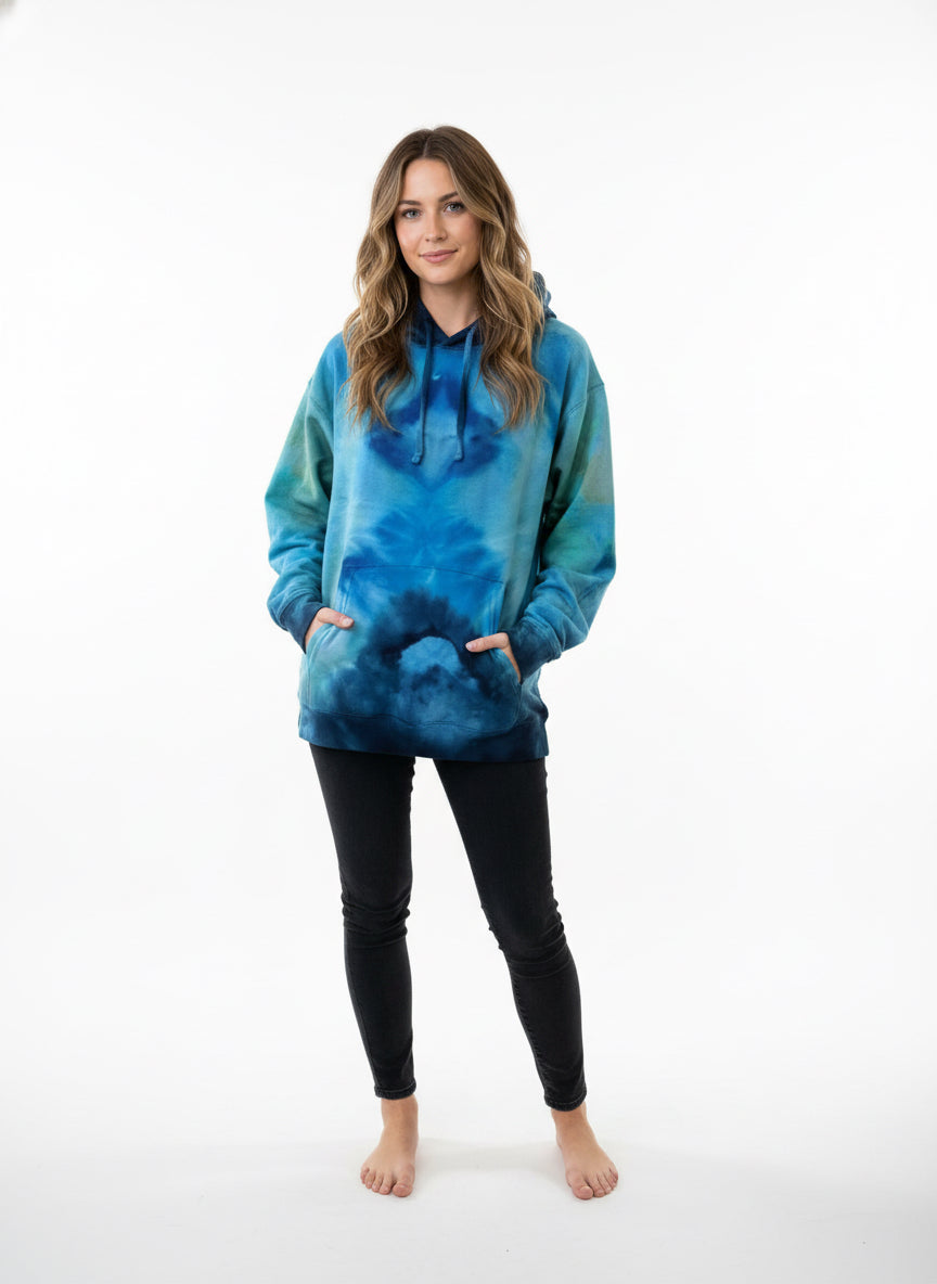 Hand-dyed by Mixed Results in Ottawa, this ocean-ink inspired spiral fade brings together deep navy, tidal teal, and soft shoreline greens in a mirrored, organic pattern. The folds created a natural echo shape across the chest and hem — a one-of-a-kind flow that can’t be repeated.