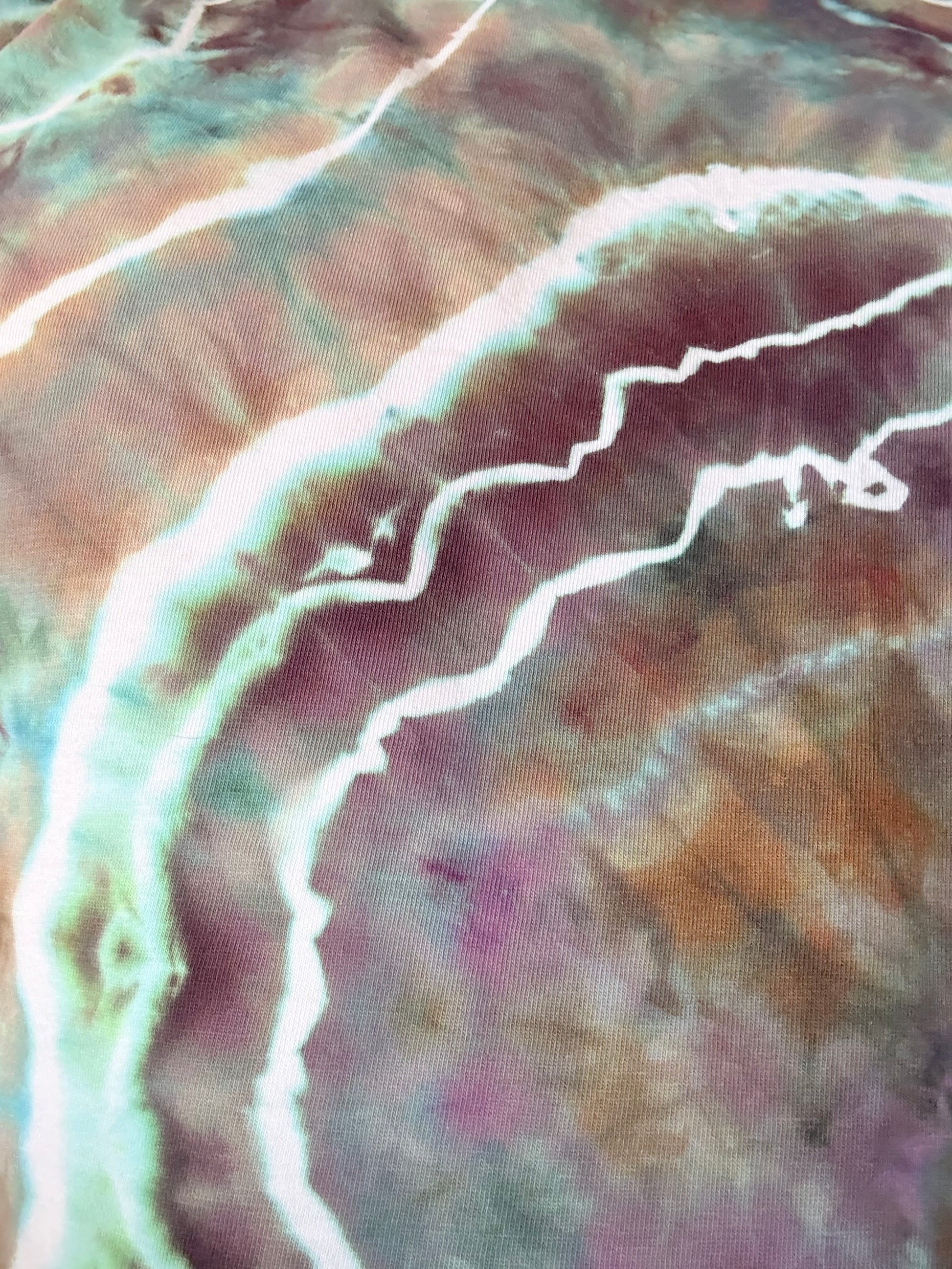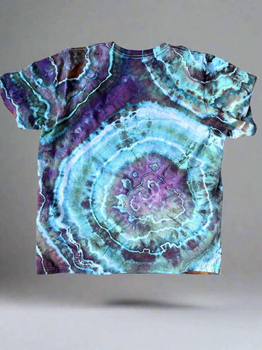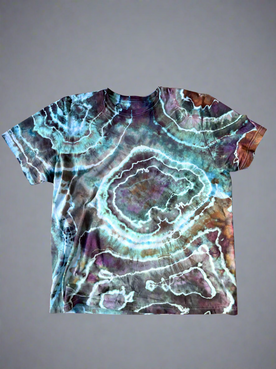 The design features earthy greens, deep purples, and flowing aqua tones, creating a marbled, almost topographic effect that feels both organic and psychedelic. Each ripple of dye is a reminder that no two shirts will ever be the same — this is true one-of-a-kind Canadian streetwear.