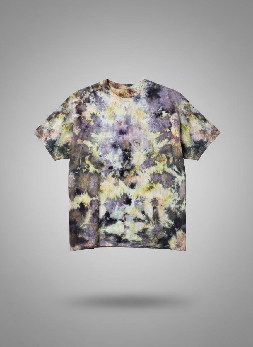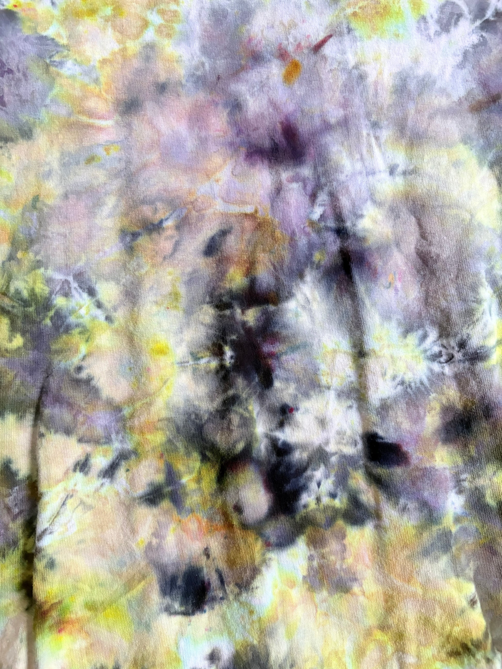 - Dye method: Ice dye with layered yellow + black + moss + grey tones